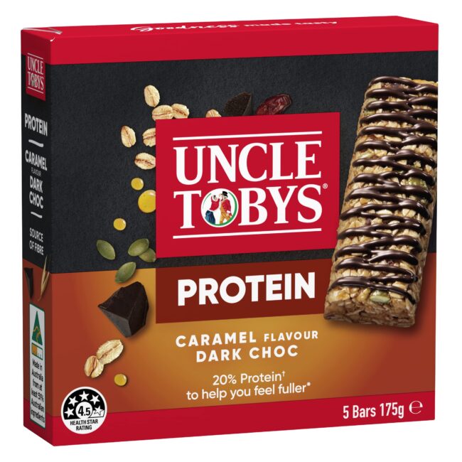 UNCLE TOBYS PROTEIN CARAMEL AND DARK CHOCOLATE MUESLI BARS SCHOOL LUNCHBOX SNACKS | 175G